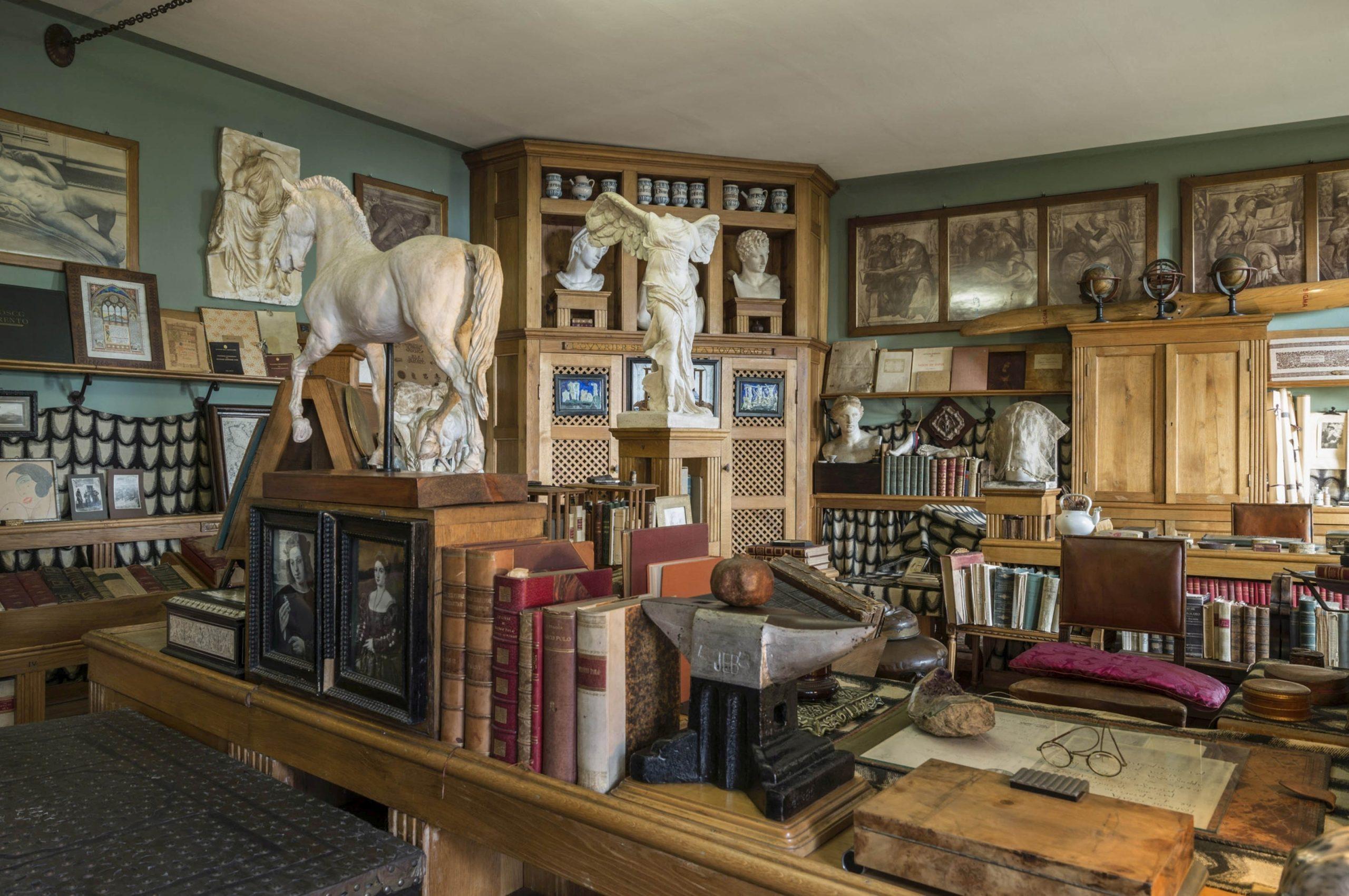 Straordinario complesso di edifici immersi in un grandissimo parco, il Vittoriale degli Italiani – eretto dal 1921 a Gardone Riviera – fu voluto dal poeta Gabriele D’Annunzio (1863-1938) per un duplice scopo: farne la sua dimora (e infatti vi trascorse gli ultimi 17 anni di vita) e nel medesimo tempo un monumento al suo genio e alle audaci imprese compiute nel corso della I Guerra Mondiale. Oggi fra i musei più visitati d’Italia, fu progettato dall’arch. Gian Carlo Maroni seguendo le precise indicazioni del Vate. Si estende su una decina di ettari di terreno e racchiude edifici, complessi monumentali, vie, piazze, un anfiteatro all’aperto con straordinaria vista sul lago, giardini e corsi d’acqua. Il suo cuore è la Piazzetta dalmata, dove si affacciano la Prioria (ultima dimora del poeta), Schifamondo (edificio destinato a diventare la nuova residenza del poeta, ma che non era ancora ultimato al momento della sua morte, che ospita il Museo D’Annunzio Eroe comunicante con l’Auditorium, alla cui cupola è appeso il piccolo aereo SVA su cui D’Annunzio compì il 9 agosto 1918 il volo su Vienna per lanciare manifestini eversivi), la Biblioteca e gli Archivi. Atmosfera di sacralità è quella che si respira all’interno della Prioria, amplificata dalla scarsa illuminazione. Vetrate dipinte, finestre con pesanti tendaggi, luci soffuse, ne fanno un luogo misterioso e suggestivo in cui il Poeta fotofobico poteva ben vivere. Nelle stanze della Prioria – casa museo simbolo del “vivere inimitabile” del Vate- sono conservati circa 10.000 oggetti e 33.000 libri, che si abbinano a frasi enigmatiche e motti, leggibili su architravi e camini, in un gioco continuo di rimandi simbolici. D’Annunzio pensò la villa con grande minuzia di particolari creando stanze atte a vari momenti di vita: dalla stanza della Musica dove amava ascoltare dietro pesanti tendaggi Luisa Bàccara, sua ultima amante, alla stanza del Lebbroso realizzata come sua ultima dimora alla sua Officina, lo studio dell’operaio della parola, come era solito definirsi.