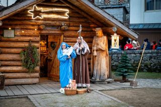 La Via del Natale invita a seguire il filo di questi allestimenti, sostando nelle botteghe artigiane dove la manualità diventa racconto, degustando dolci e calde bevande natalizie, visitando luoghi speciali, come La Casa del Tè e il Cason dei Boscadôrs: un percorso a tappe per entrare nel pieno dell’atmosfera natalizia e visitare Sutrio Paese Presepe, ideale per le famiglie. Punto di partenza ideale è il Presepe che ha campeggiato in Piazza San Pietro nel 2022: oggi risplende nella piazzetta sotto il Municipio, con una ventina di statue a grandezza naturale scolpite nel cedro, disposte su 116 metri quadrati, illuminate da 50 punti luce. La grotta, anch’essa in legno, è una cupola alta 5,65 metri (per 41 mq), un abbraccio scenografico che si accende di sera. Per realizzarla, nessun albero è stato abbattuto: un gesto coerente con la montagna che accoglie senza ferire.